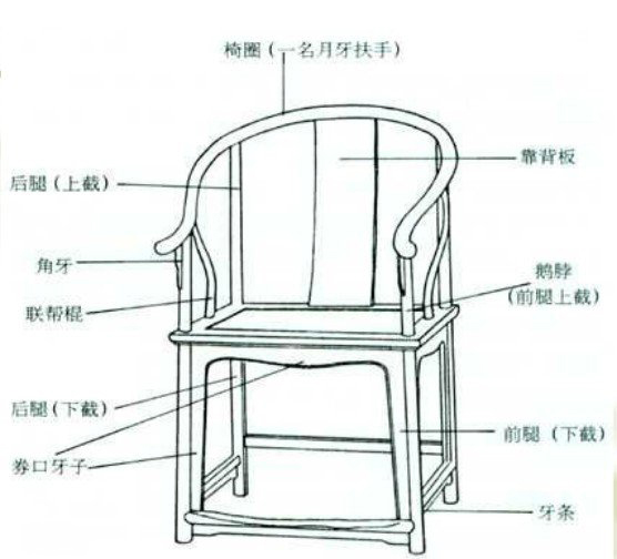 關(guān)于圈椅的結(jié)構(gòu)構(gòu)造,我們就用最經(jīng)典也是最原始的明式圈椅作為描述對象,它的每個結(jié)構(gòu)構(gòu)造以及命名術(shù)語包括: