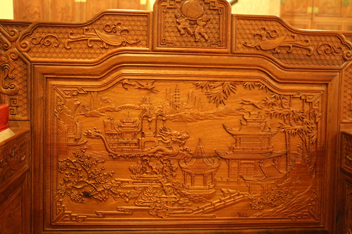 第四類,山水風(fēng)景圖案常常和人物圖案結(jié)合在一起,出現(xiàn)在紅木家具上,山水風(fēng)景多為名山大川,人物多是反映歷史典故、神話傳說、詩詞故事和文人生活的畫面,如游歸圖、南山觀瀑、五老圖、八仙圖、十八羅漢、嫦娥奔月、三星高照、群仙祝壽、百子圖、東籬采菊圖等,工匠們以中國畫的散點繪畫技法為基礎(chǔ)進行生動描繪和勾勒。